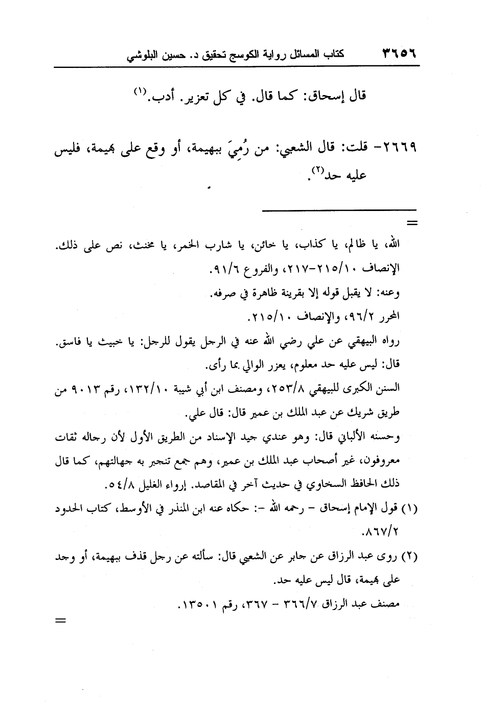 [2669-] قلت: قال الشعبي: من رُمِيَ ببهيمة، أو وقع على بهيمة، فليس عليه حد 2.