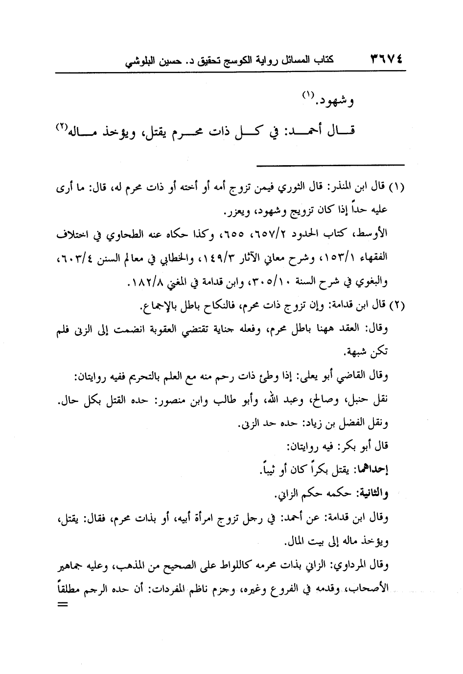 وقال المرداوي: الزاني بذات محرمه كاللواط على الصحيح من المذهب، وعليه جماهير الأصحاب، وقدمه في الفروع وغيره، وجزم ناظم المفردات: أن حده الرجم مطلقاً حتماً وهو منها.