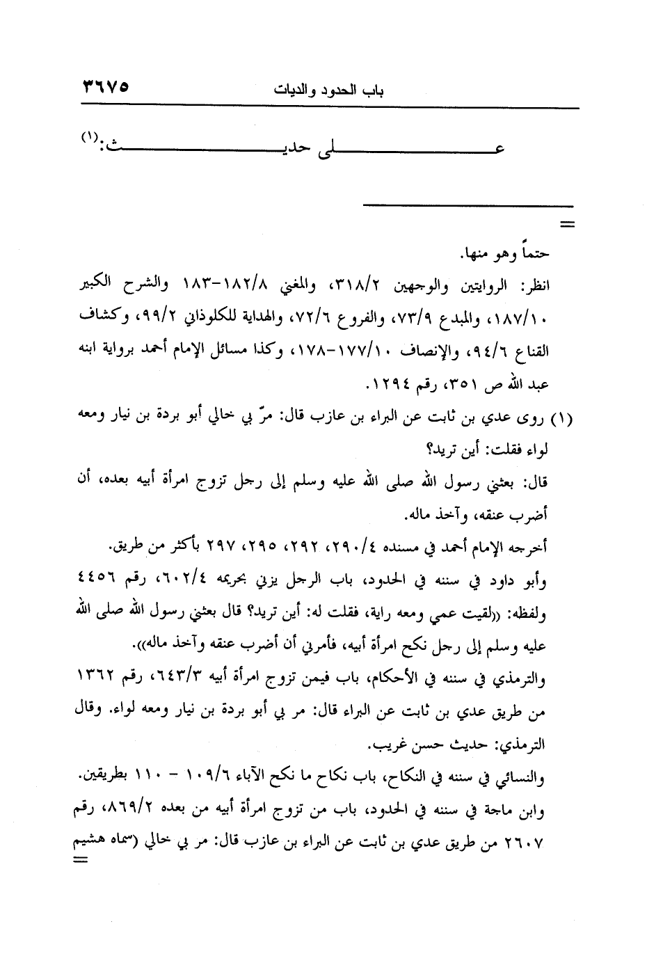 وأبو داود في سننه في الحدود، باب الرجل يزني بحريمه 4/602، رقم 4456 ولفظه: "لقيت عمي ومعه راية، فقلت له: أين تريد؟ قال بعثني رسول الله صلى الله عليه وسلم إلى رجل نكح امرأة أبيه، فأمرني أن أضرب عنقه وآخذ ماله".