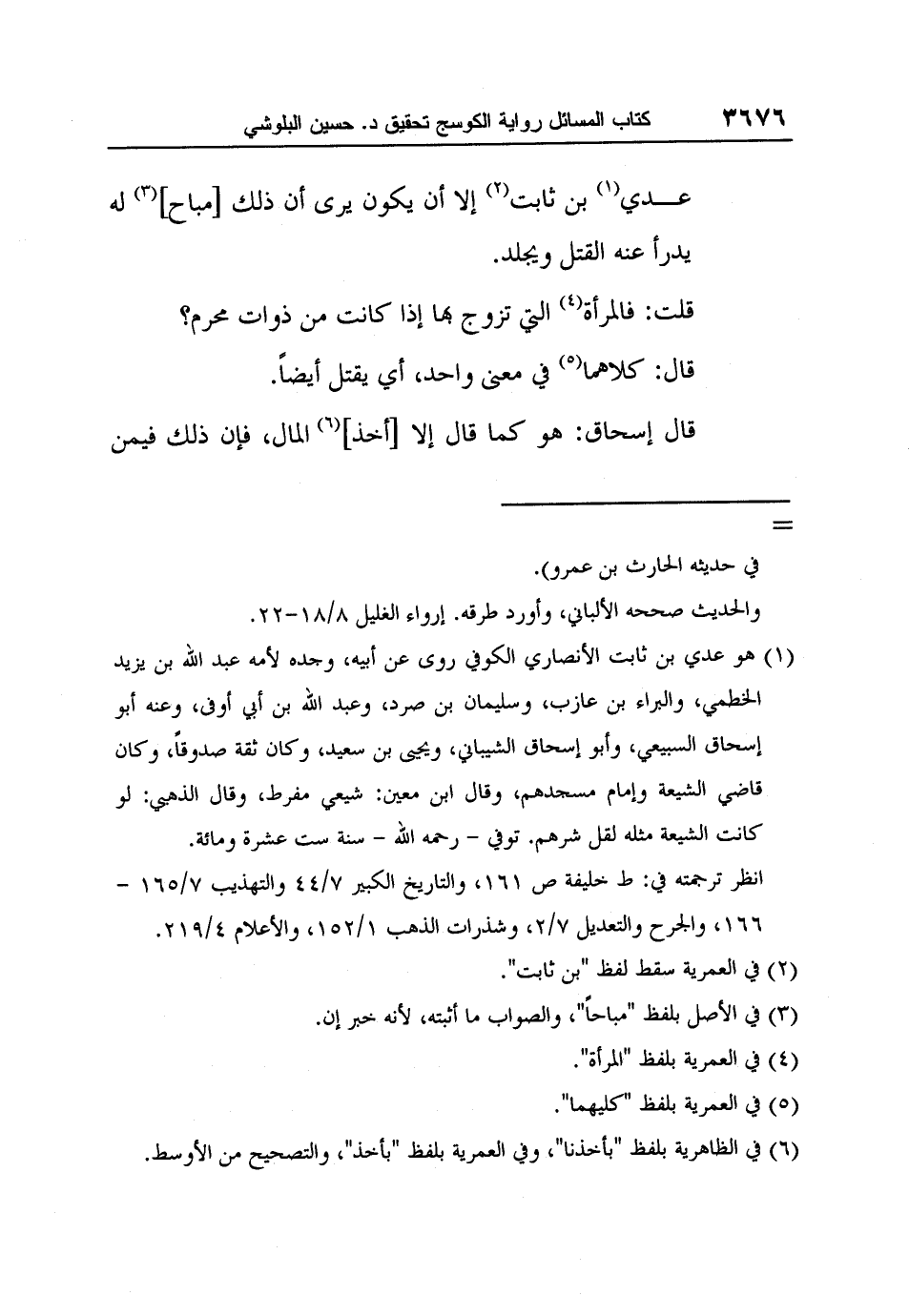 عدي 1 بن ثابت 2 إلا أن يكون يرى أن ذلك [مباح] 3 له يدرأ عنه القتل ويجلد.