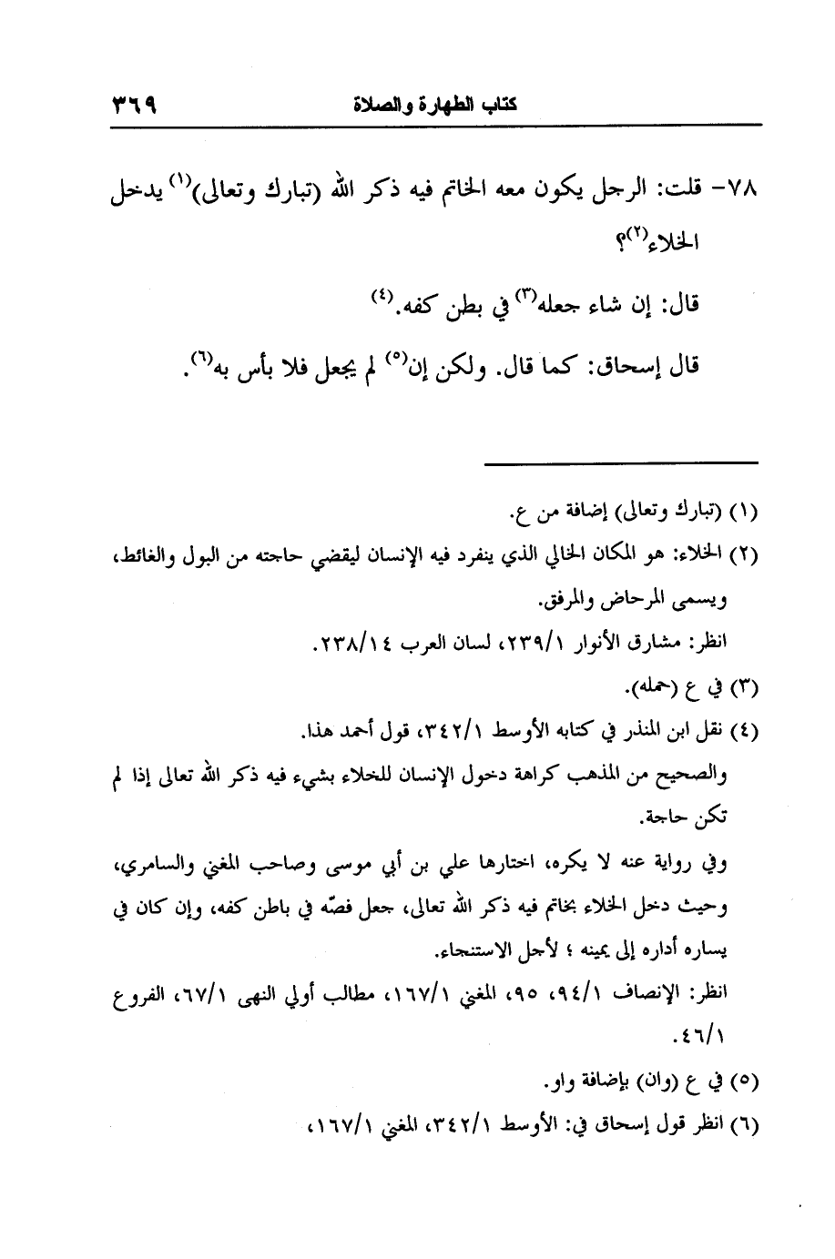 [78-] قلت: الرجل يكون معه الخاتم فيه ذكر الله (تبارك وتعالى) 1 يدخل الخلاء2؟