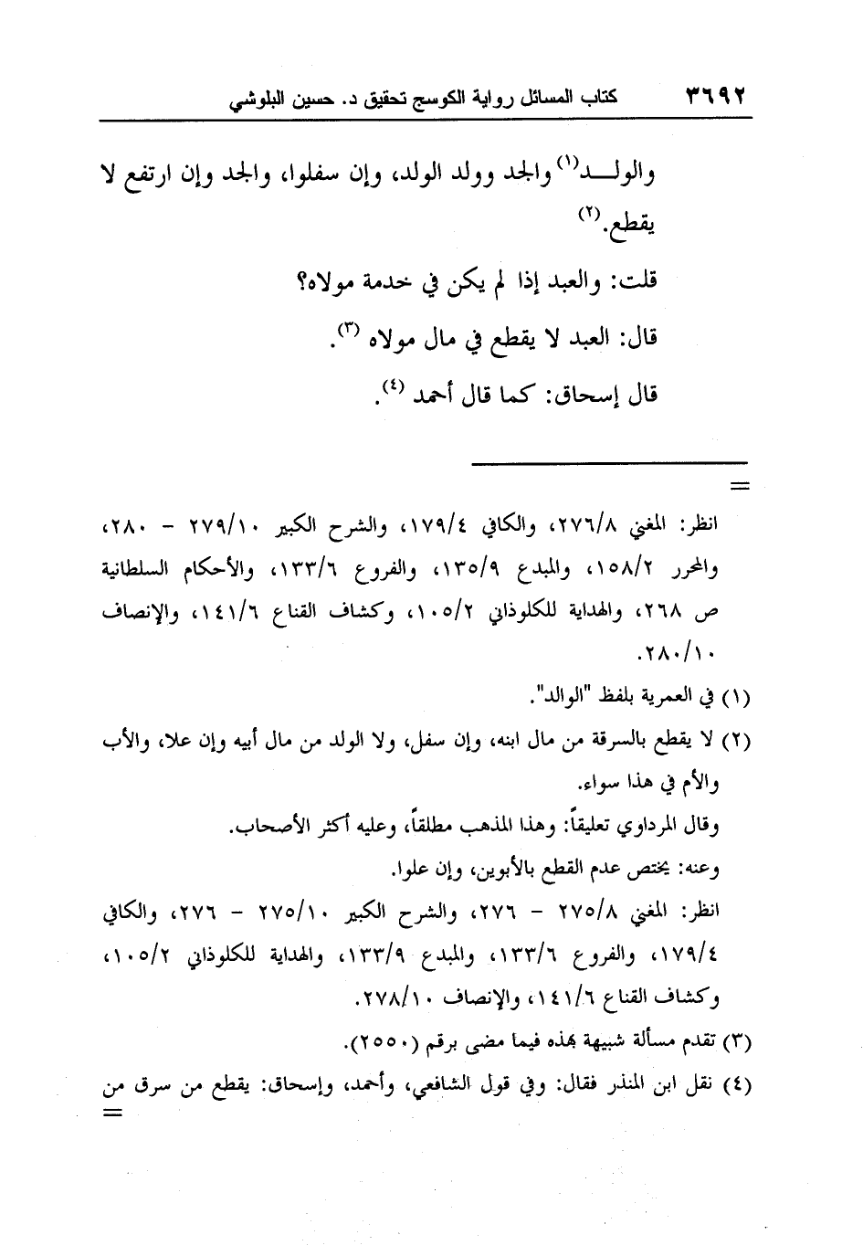 2 لا يقطع بالسرقة من مال ابنه، وإن سفل، ولا الولد من مال أبيه وإن علا، والأب والأم في هذا سواء.