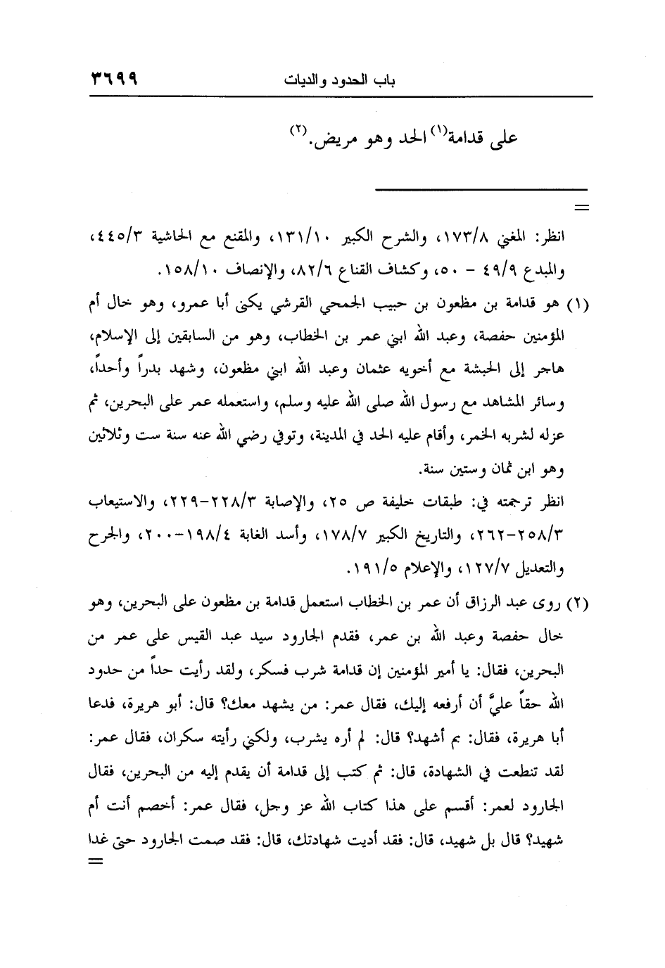 2 روى عبد الرزاق أن عمر بن الخطاب استعمل قدامة بن مظعون على البحرين، وهو خال حفصة وعبد الله بن عمر، فقدم الجارود سيد عبد القيس على عمر من البحرين، فقال: يا أمير المؤمنين إن قدامة شرب فسكر، ولقد رأيت حداً من حدود الله حقاً عليَّ أن أرفعه إليك، فقال عمر: من يشهد معك؟ قال: أبو هريرة، فدعا أبا هريرة، فقال: بم أشهد؟ قال: لم أره يشرب، ولكني رأيته سكران، فقال عمر: لقد تنطعت في الشهادة، قال: ثم كتب إلى قدامة أن يقدم إليه من البحرين، فقال الجارود لعمر: أقسم على هذا كتاب الله عز وجل، فقال عمر: أخصم أنت أم شهيد؟ قال بل شهيد، قال: فقد أديت شهادتك، قال: فقد صمت الجارود حتى غدا على عمر، فقال: أقم على هذا حد الله، فقال عمر: ما أراك إلا خصماً، وما شهد معك إلا رجل، فقال الجارود: إني أنشدك الله، فقال: لتمسكن لسانك، أو لأسوءنك، فقال الجارود: أما والله ما ذاك بالحق أن يشرب ابن عمك وتسوؤني، فقال أبو هريرة: إن كنت تشك في شهادتنا فأرسل إلى ابنة الوليد فسلها، وهي امرأة قدامة، فأرسل عمر إلى هند ابنة الوليد ينشدها، فأقامت الشهادة على زوجها، فقال عمر لقدامة: إني حادك، فقال: لو شربت كما يقولون، ما كان لكم أن تجلدوني، فقال عمر: لم؟ قال قدامة: قال الله تعالى: {لَيْسَ عَلَى الَّذِينَ آمَنُوا وَعَمِلُوا الصَّالِحَاتِ جُنَاحٌ فِيمَا طَعِمُوا إِذَا مَا اتَّقَوْا وَآمَنُوا وَعَمِلُوا} الآية فقال عمر: أخطأت التأويل، إنك إذا اتقيت اجتنبت ما حرم الله عليك، قال: ثم أقبل عمر على الناس فقال: ماذا ترون في جلد قدامة؟ قالوا: لا نرى أن تجلده ما كان مريضاً، فسكت عن ذلك أياماً. وأصبح يوماً وقد عزم على جلده، فقال لأصحابه: ماذا ترون في جلد قدامة؟ قالوا: لا نرى أن تجلده ما كان ضعيفاً، فقال عمر: لأن يلقى الله تحت السياط أحب إليَّ من أن يلقاه وهو في عنقي، ائتوني بسوط تام، فأمر بقدامة فجلد.