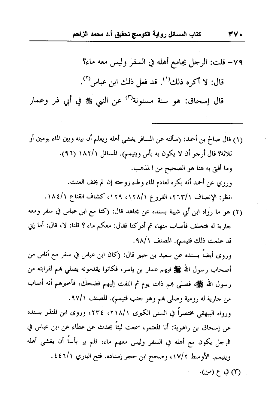 1 قال صالح بن أحمد: (سألته عن المسافر يغشى أهله ويعلم أن بينه وبين الماء يومين أو ثلاثة؟ قال أرجو أن لا يكون به بأس ويتيمم) . المسائل 1/182 (96) .
