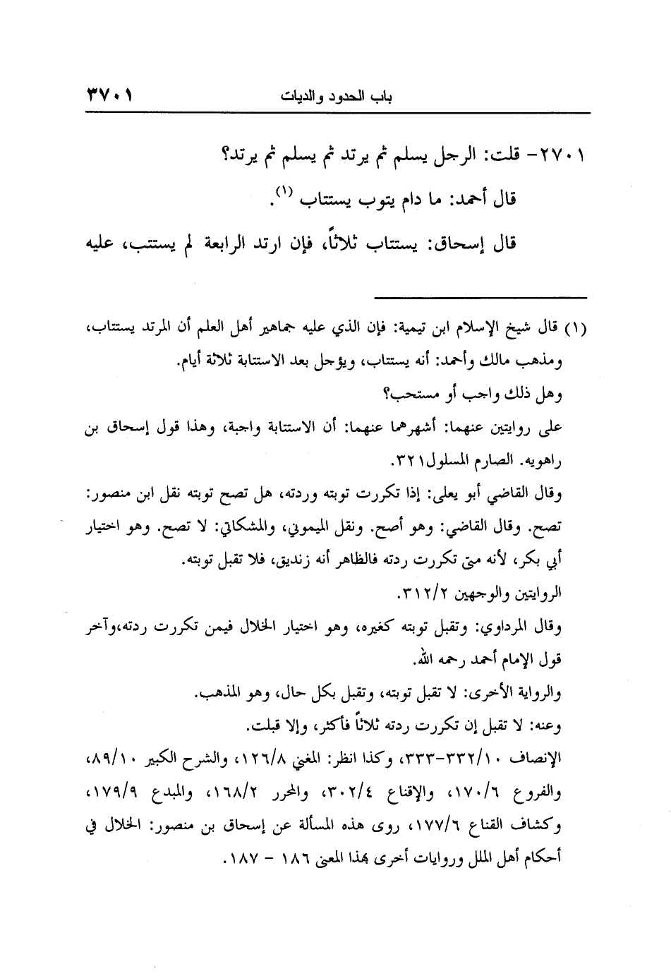 1 قال شيخ الإسلام ابن تيمية: فإن الذي عليه جماهير أهل العلم أن المرتد يستتاب، ومذهب مالك وأحمد: أنه يستتاب، ويؤجل بعد الاستتابة ثلاثة أيام.