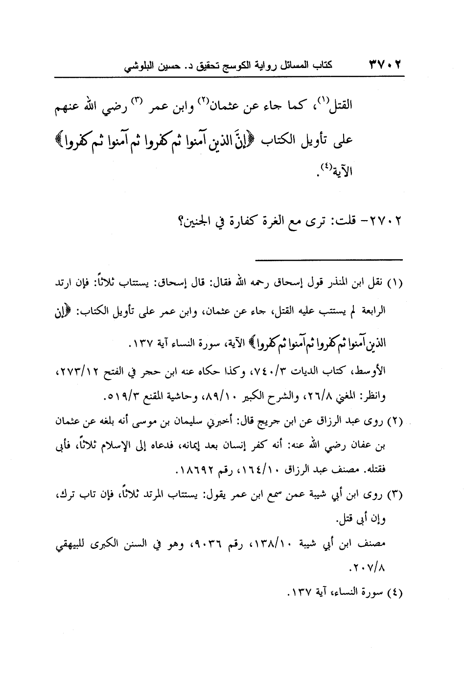 القتل 1، كما جاء عن عثمان 2 وابن عمر 3 رضي الله عنهم على تأويل الكتاب {إِنَّ الَّذِينَ آمَنُوا ثُمَّ كَفَرُوا ثُمَّ آمَنُوا ثُمَّ كَفَرُوا} الآية 4.