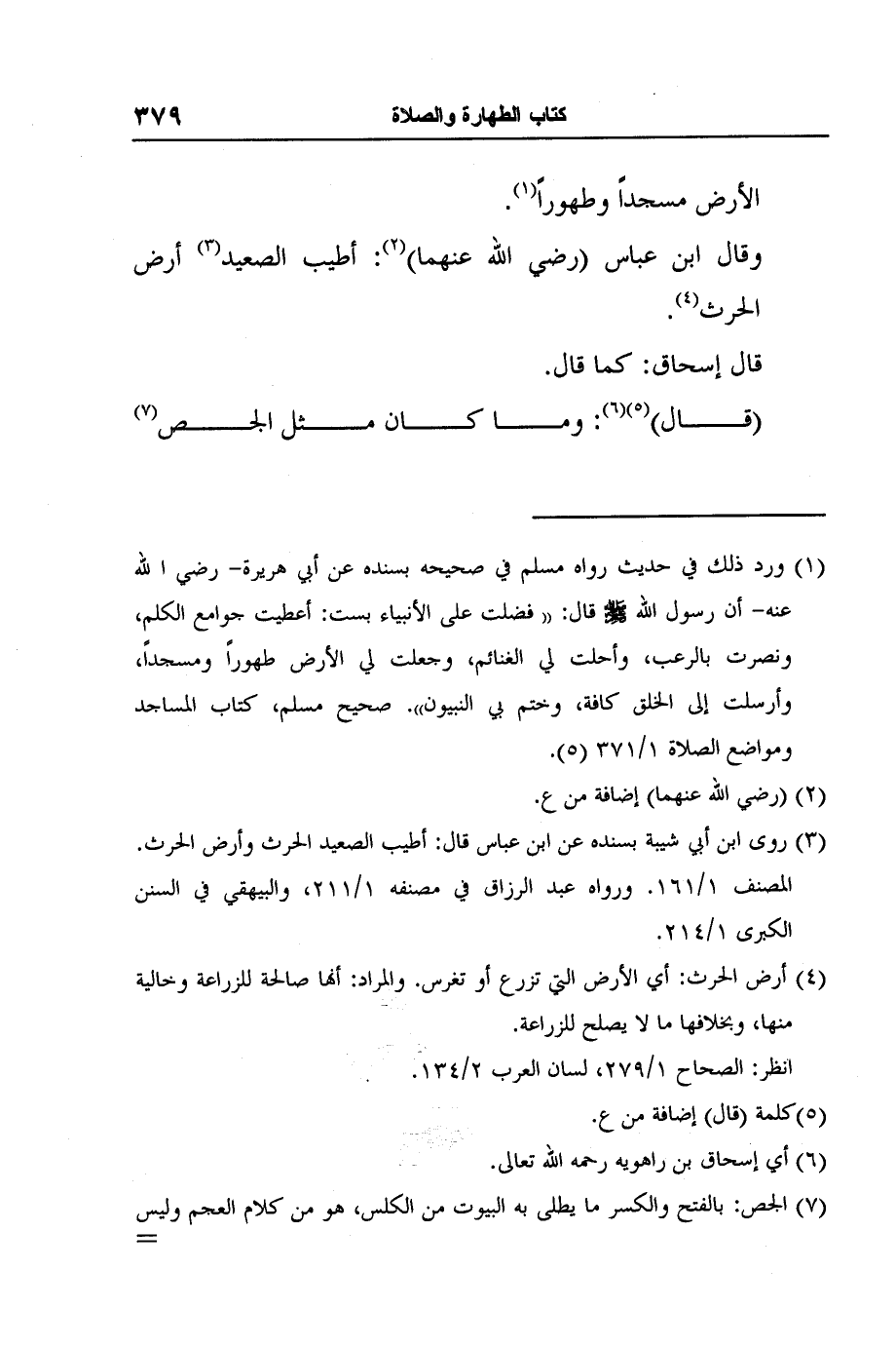 3 روى ابن أبي شيبة بسنده عن ابن عباس قال: أطيب الصعيد الحرث وأرض الحرث. المصنف 1/161. ورواه عبد الرزاق في مصنفه 1/211، والبيهقي في السنن الكبرى 1/214.