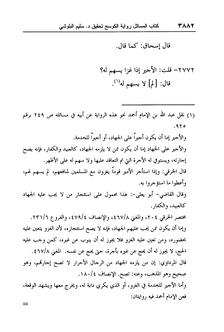 وأما الأجير للخدمة في الغزو، أو الذي يكري دابة له، ويخرج معها ويشهد الوقعة، فعن الإمام أحمد فيه روايتان: