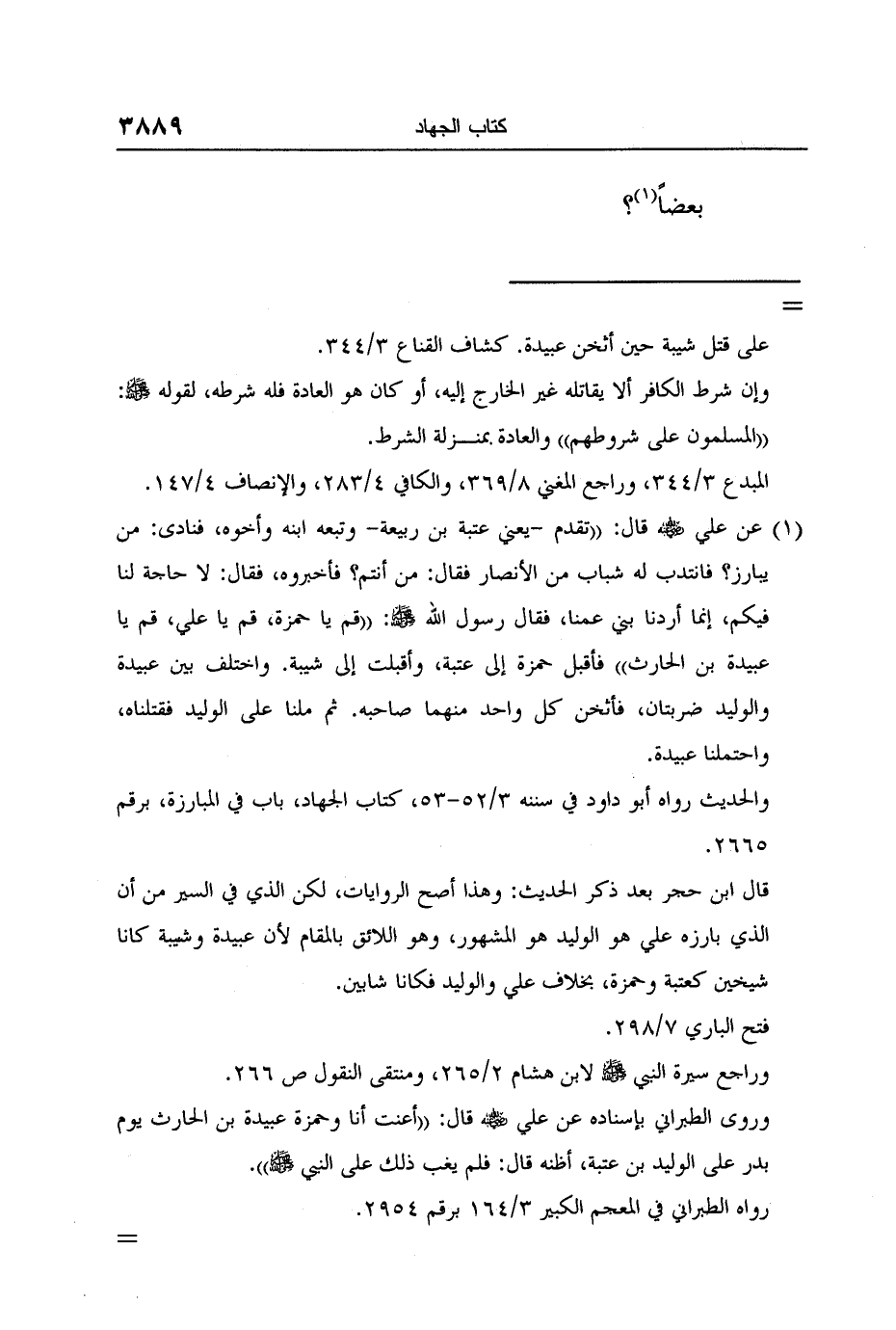 1 عن علي رضي الله عنه قال: "تقدم -يعني عتبة بن ربيعة- وتبعه ابنه وأخوه، فنادى: من يبارز؟ فانتدب له شباب من الأنصار فقال: من أنتم؟ فأخبروه، فقال: لا حاجة لنا فيكم، إنما أردنا بني عمنا، فقال رسول الله صلى الله عليه وسلم: "قم يا حمزة، قم يا علي، قم يا عبيدة بن الحارث" فأقبل حمزة إلى عتبة، وأقبلت إلى شيبة. واختلف بين عبيدة والوليد ضربتان، فأثخن كل واحد منهما صاحبه. ثم ملنا على الوليد فقتلناه، واحتملنا عبيدة.