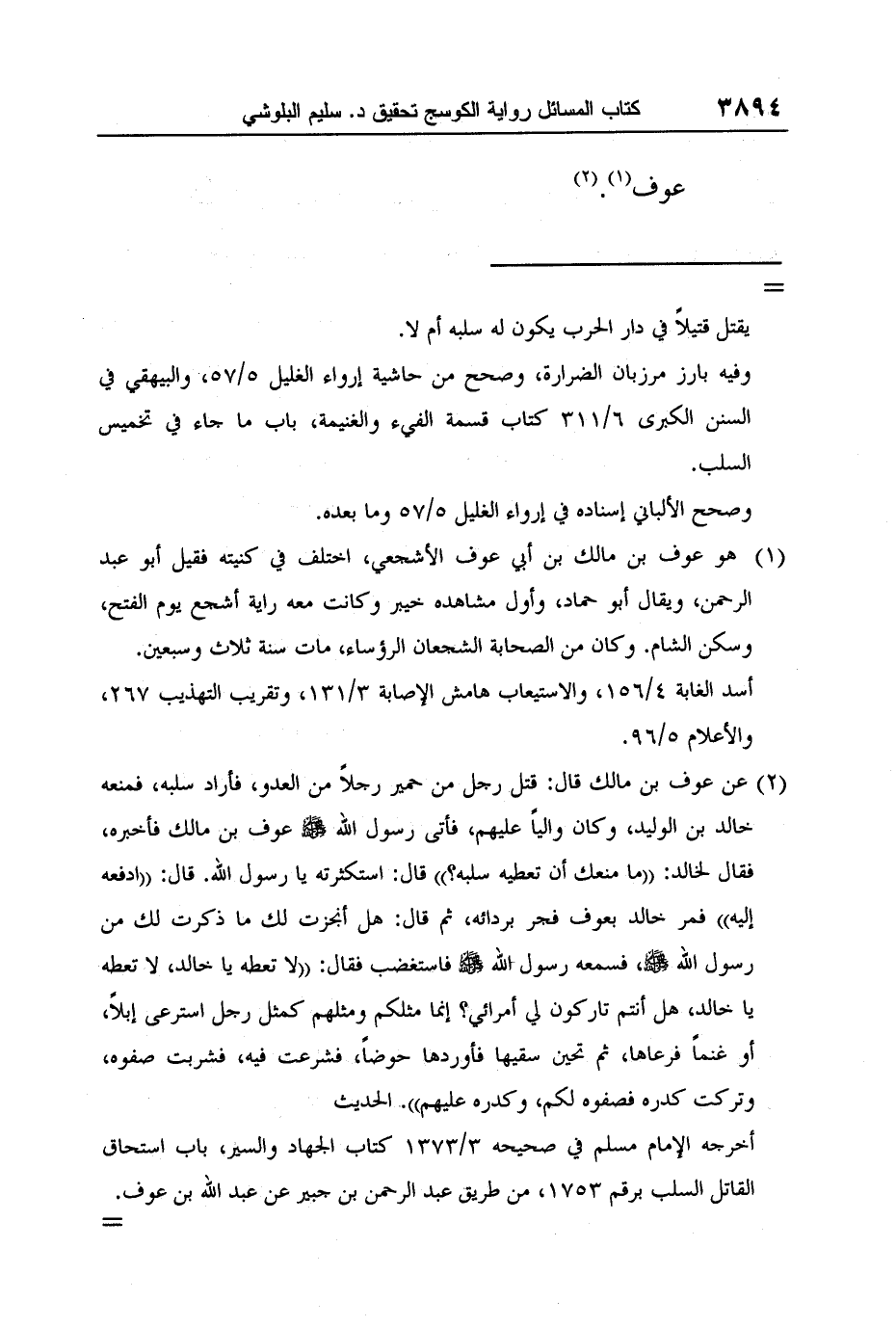 2 عن عوف بن مالك قال: قتل رجل من حمير رجلاً من العدو، فأراد سلبه، فمنعه خالد بن الوليد، وكان والياً عليهم، فأتى رسول الله صلى الله عليه وسلم عوف بن مالك فأخبره، فقال لخالد: "ما منعك أن تعطيه سلبه؟ " قال: استكثرته يا رسول الله. قال: "ادفعه إليه" فمر خالد بعوف فجر بردائه، ثم قال: هل أنجزت لك ما ذكرت لك من رسول الله صلى الله عليه وسلم، فسمعه رسول الله صلى الله عليه وسلم فاستغضب فقال: "لا تعطه يا خالد، لا تعطه يا خالد، هل أنتم تاركون لي أمرائي؟ إنما مثلكم ومثلهم كمثل رجل استرعى إبلاً، أو غنماً فرعاها، ثم تحين سقيها فأوردها حوضاً، فشرعت فيه، فشربت صفوه، وتركت كدره فصفوه لكم، وكدره عليهم". الحديث