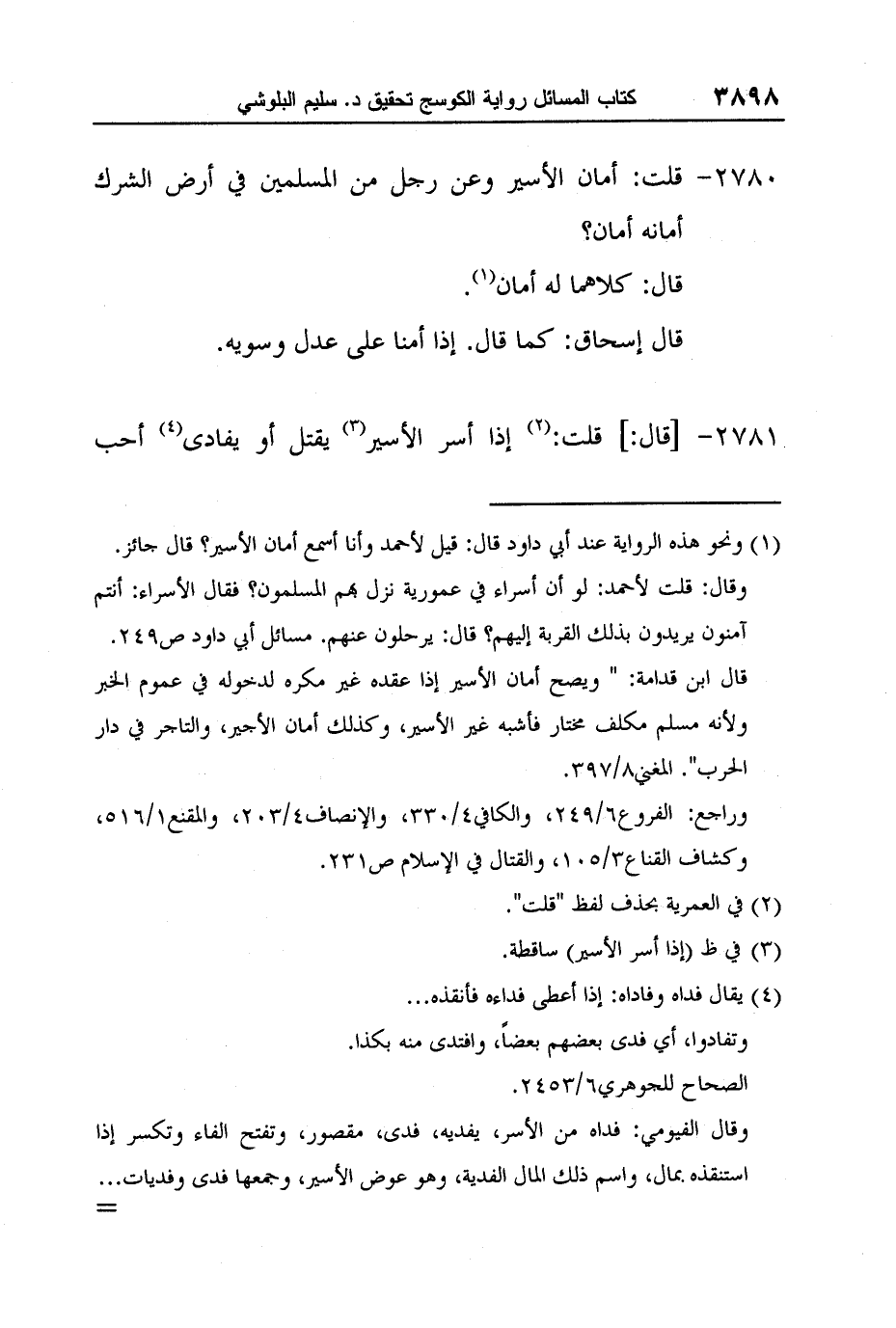 1 ونحو هذه الرواية عند أبي داود قال: قيل لأحمد وأنا أسمع أمان الأسير؟ قال جائز.