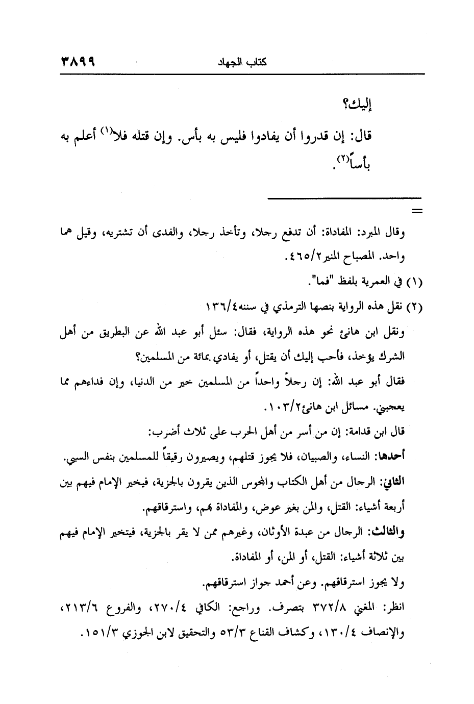 فقال أبو عبد الله: إن رجلاً واحداً من المسلمين خير من الدنيا، وإن فداءهم مما يعجبني. مسائل ابن هانئ2/103.