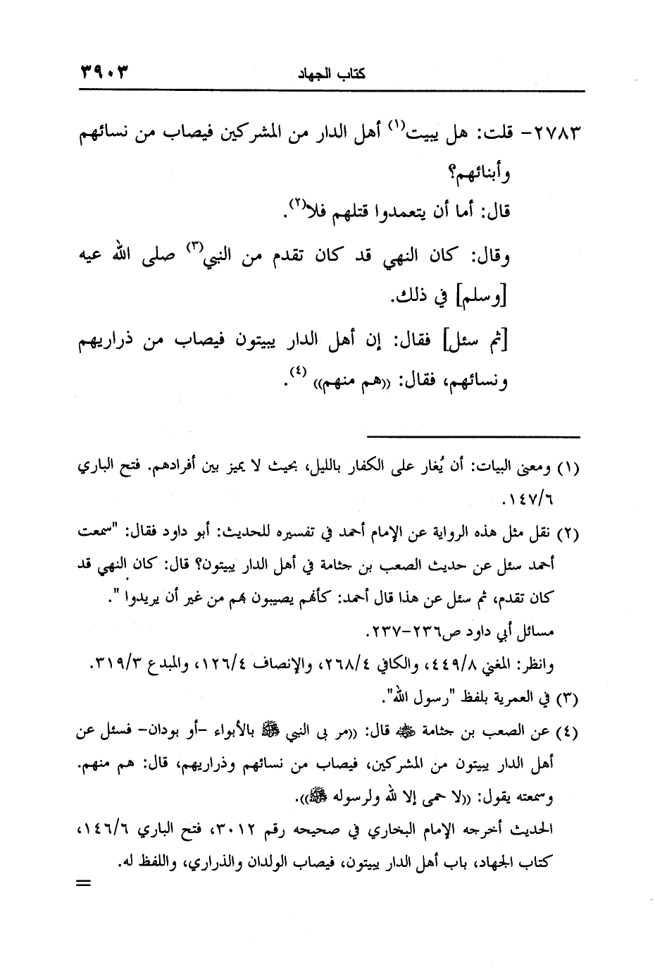 2 نقل مثل هذه الرواية عن الإمام أحمد في تفسيره للحديث: أبو داود فقال: "سمعت أحمد سئل عن حديث الصعب بن جثامة في أهل الدار يبيتون؟ قال: كان النهي قد كان تقدم، ثم سئل عن هذا قال أحمد: كأنهم يصيبون بهم من غير أن يريدوا ".