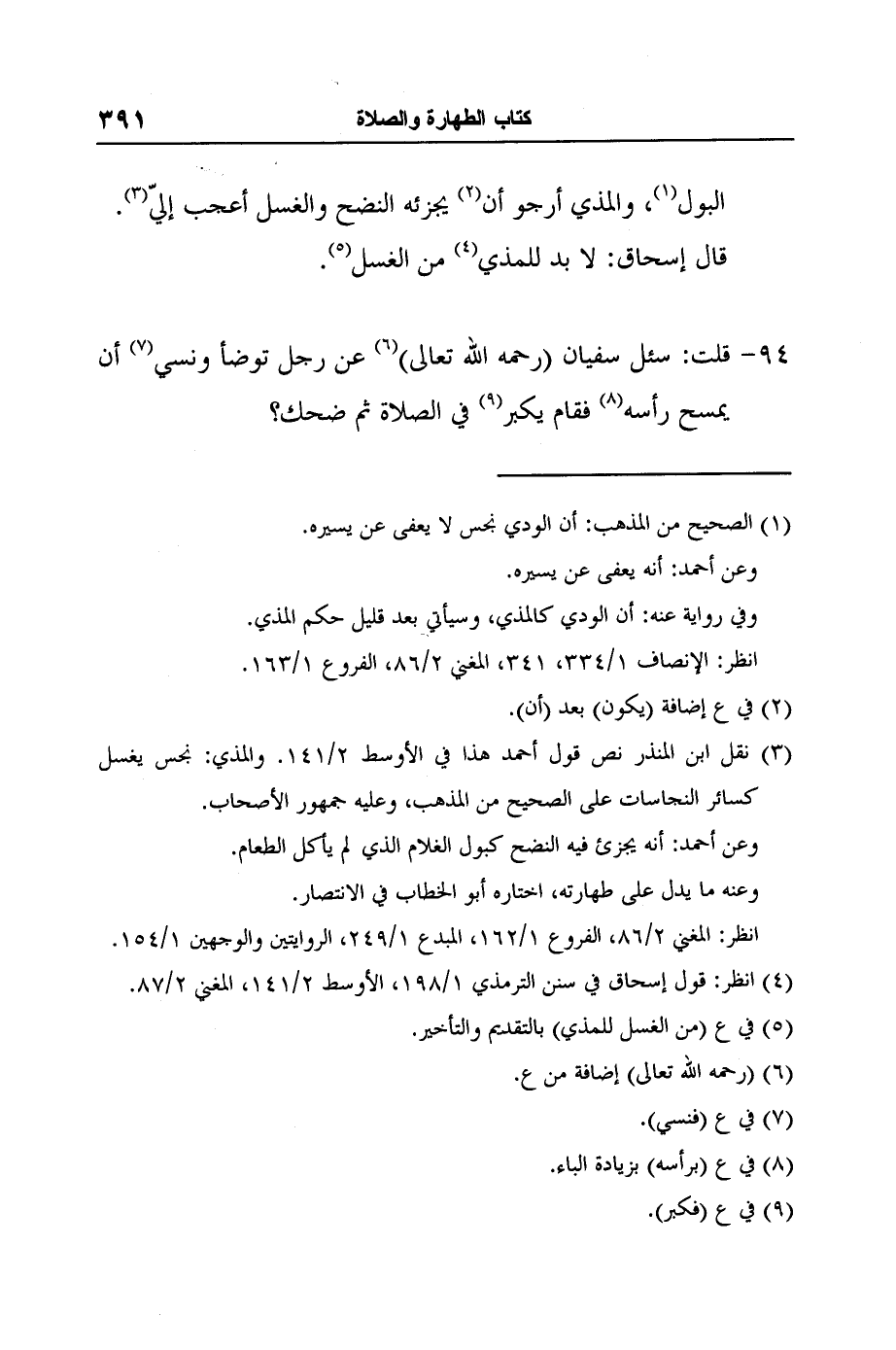 3 نقل ابن المنذر نص قول أحمد هذا في الأوسط 2/141. والمذي: نجس يغسل كسائر النجاسات على الصحيح من المذهب، وعليه جمهور الأصحاب.