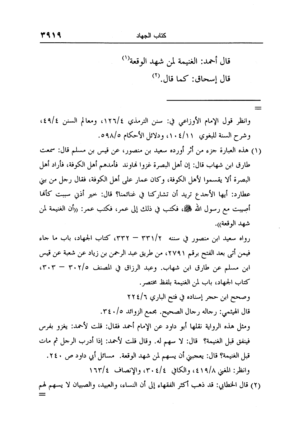 1 هذه العبارة جزء من أثر أورده سعيد بن منصور، عن قيس بن مسلم قال: سمعت طارق ابن شهاب قال: إن أهل البصرة غزوا نهاوند فأمدهم أهل الكوفة، فأراد أهل البصرة ألا يقسموا لأهل الكوفة، وكان عمار على أهل الكوفة، فقال رجل من بني عطارد: أيها الأجدع تريد أن تشاركنا في غنائمنا؟ قال: خير أذني سببت كأنها أصيبت مع رسول الله صلى الله عليه وسلم، فكتب في ذلك إلى عمر، فكتب عمر: "أن الغنيمة لمن شهد الوقعة".