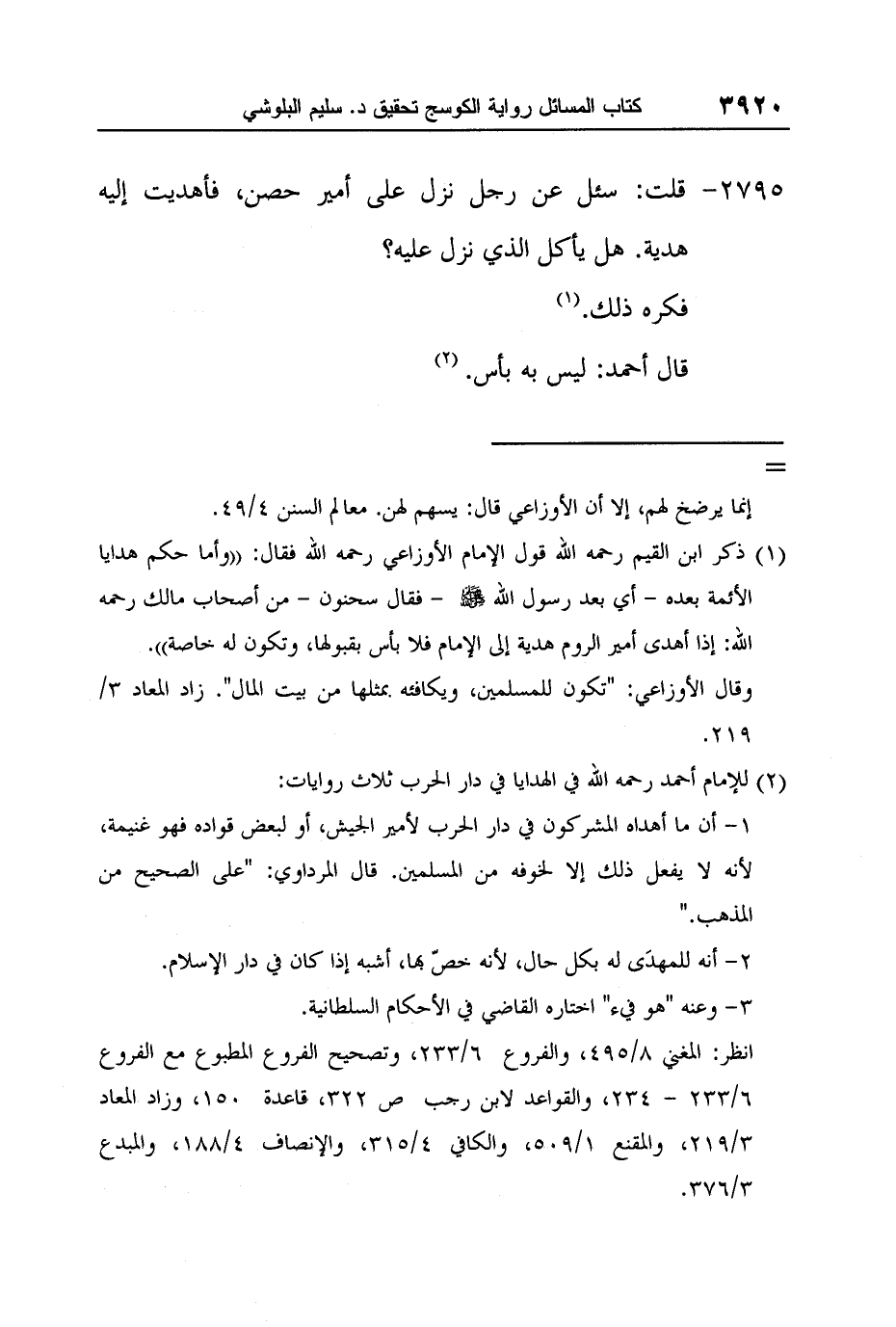 1 ذكر ابن القيم رحمه الله قول الإمام الأوزاعي رحمه الله فقال: "وأما حكم هدايا الأئمة بعده - أي بعد رسول الله صلى الله عليه وسلم - فقال سحنون - من أصحاب مالك رحمه الله: إذا أهدى أمير الروم هدية إلى الإمام فلا بأس بقبولها، وتكون له خاصة".