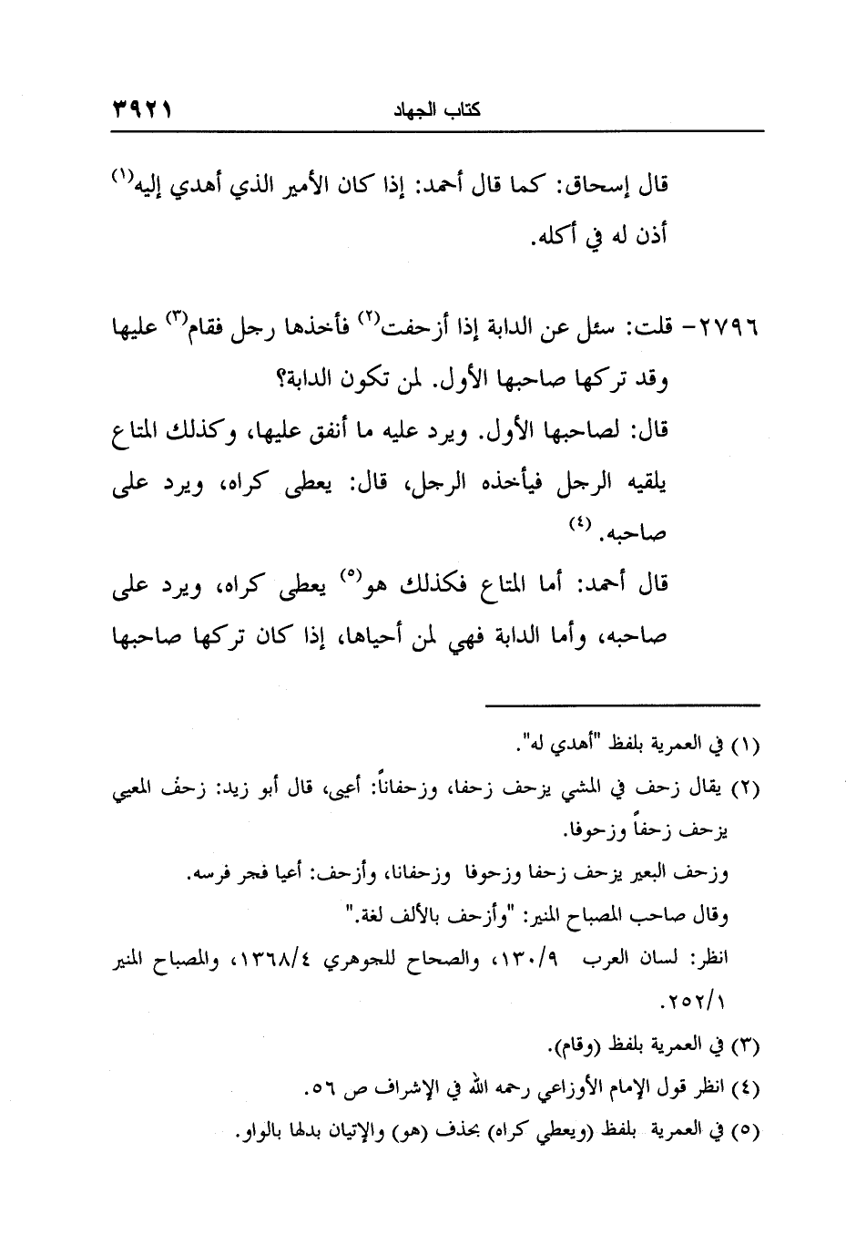 [2796-] قلت: سئل عن الدابة إذا أزحفت2 فأخذها رجل فقام3 عليها وقد تركها صاحبها الأول. لمن تكون الدابة؟