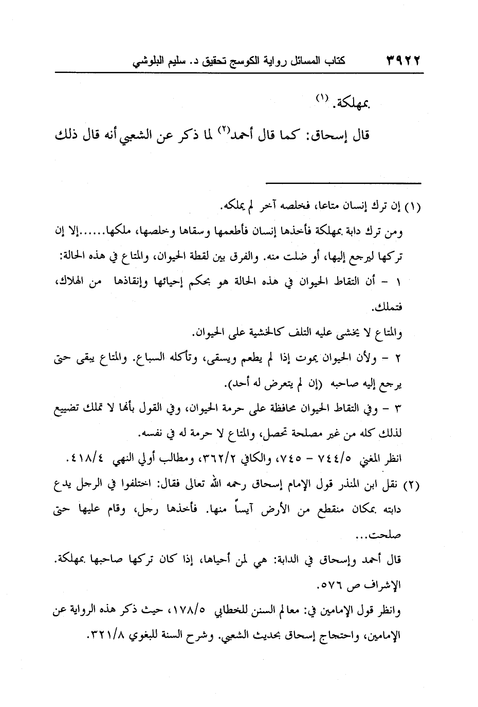 2 نقل ابن المنذر قول الإمام إسحاق رحمه الله تعالى فقال: اختلفوا في الرجل يدع دابته بمكان منقطع من الأرض آيساً منها. فأخذها رجل، وقام عليها حتى صلحت ...