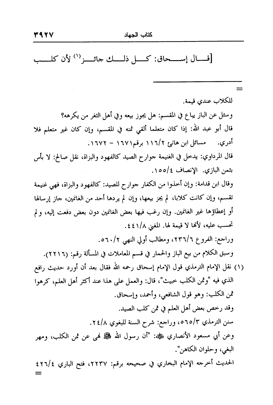 1 نقل الإمام الترمذي قول الإمام إسحاق رحمه الله فقال بعد أن أورد حديث رافع الذي فيه "وثمن الكلب خبيث"، قال: والعمل على هذا عند أكثر أهل العلم، كرهوا ثمن الكلب: وهو قول الشافعي، وأحمد، وإسحاق.