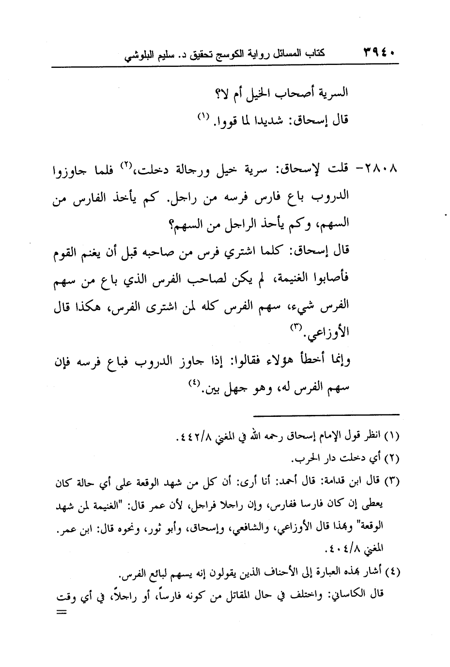 [2808-] قلت لإسحاق: سرية خيل ورجالة دخلت،2 فلما جاوزوا الدروب باع فارس فرسه من راجل. كم يأخذ الفارس من السهم، وكم يأحذ الراجل من السهم؟