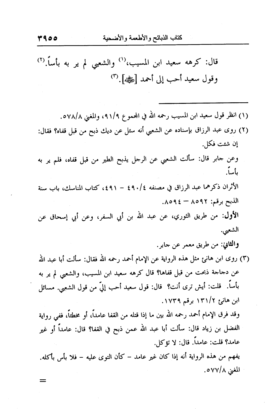3 روى ابن هانئ مثل هذه الرواية عن الإمام أحمد رحمه الله فقال: سألت أبا عبد الله عن دجاجة ذبحت من قبل قفاها؟ قال كرهه سعيد ابن المسيب، والشعبي لم ير به بأساً. قلت: أيش ترى أنت؟ قال: قول سعيد أحب إليّ من قول الشعبي. مسائل ابن هانئ 2/131 برقم 1739.
