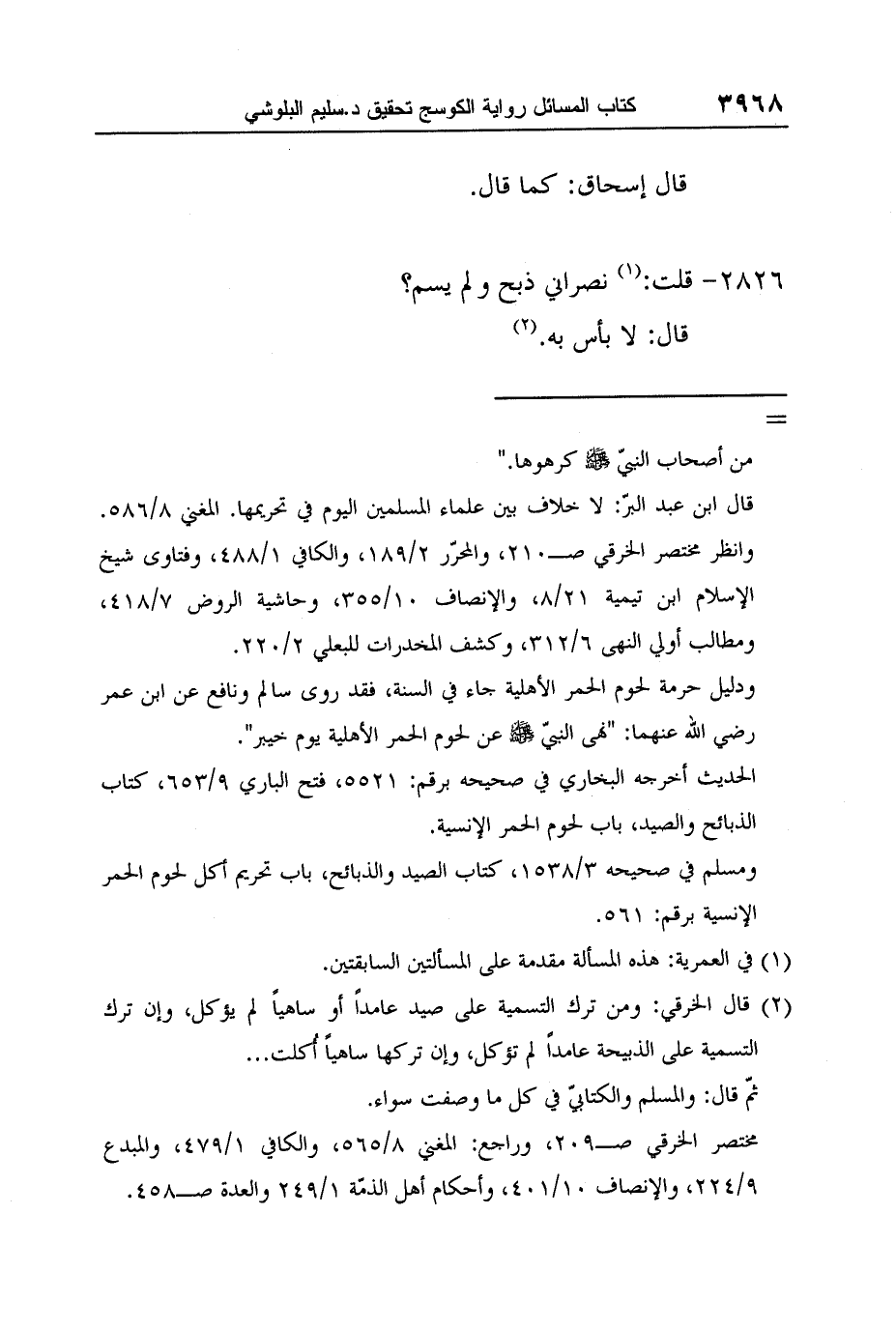 2 قال الخرقي: ومن ترك التسمية على صيد عامداً أو ساهياً لم يؤكل، وإن ترك التسمية على الذبيحة عامداً لم تؤكل، وإن تركها ساهياً أُكلت ...