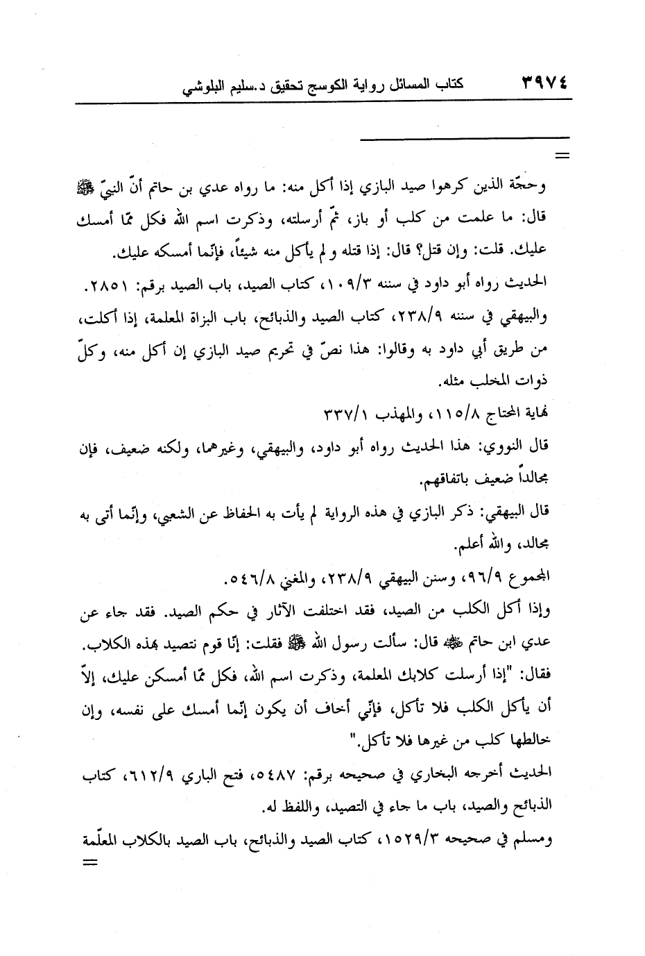 وأيضاً فرواية عديّ صريحة مقرونة بالتعليل المناسب للتحريم، وهو خوف الإمساك على نفسه متأيدة بأن الأصل في الميتة التحريم، فإذا شككنا في السبب المبيح، رجعنا إلى الأصل.