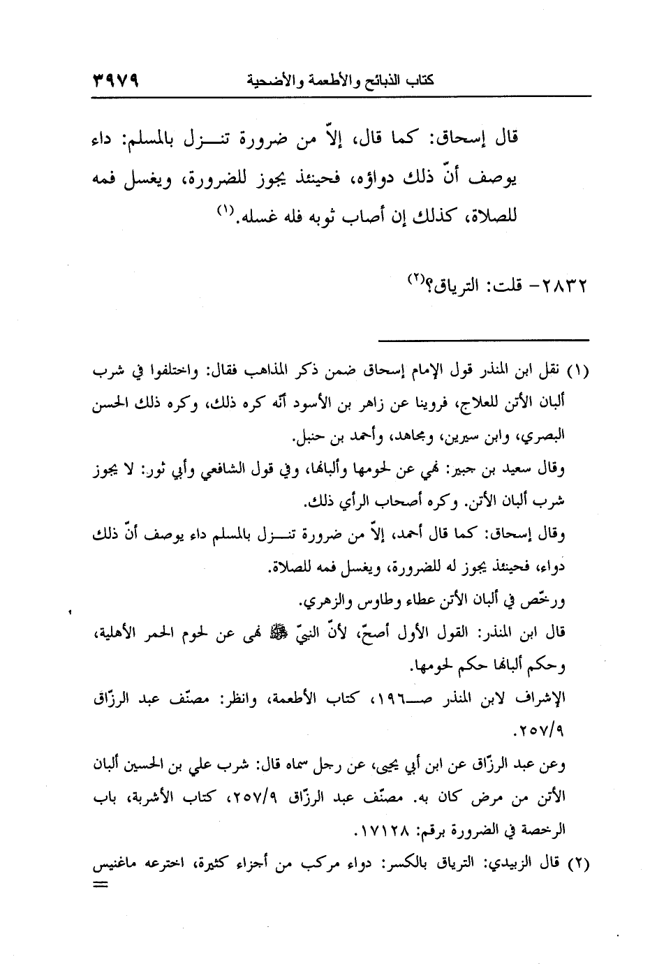 1 نقل ابن المنذر قول الإمام إسحاق ضمن ذكر المذاهب فقال: واختلفوا في شرب ألبان الأتن للعلاج، فروينا عن زاهر بن الأسود أنّه كره ذلك، وكره ذلك الحسن البصري، وابن سيرين، ومجاهد، وأحمد بن حنبل.