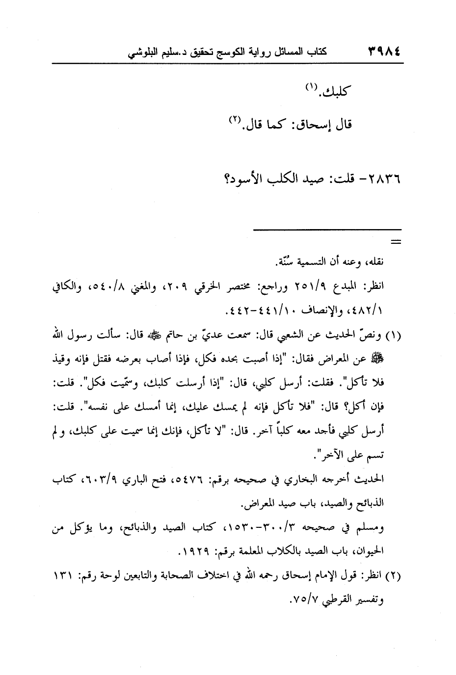 1 ونصّ الحديث عن الشعبي قال: سمعت عديّ بن حاتم رضي الله عنه قال: سألت رسول الله صلى الله عليه وسلم عن المعراض فقال: "إذا أصبت بحده فكل، فإذا أصاب بعرضه فقتل فإنه وقيذ فلا تأكل". فقلت: أرسل كلبي، قال: "إذا أرسلت كلبك، وسمّيت فكل". قلت: فإن أكل؟ قال: "فلا تأكل فإنه لم يمسك عليك، إنما أمسك على نفسه". قلت: أرسل كلبي فأجد معه كلباً آخر. قال: "لا تأكل، فإنك إنما سميت على كلبك، ولم تسم على الآخر".