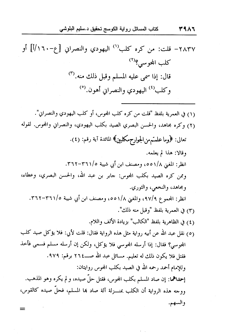 [2837-] قلت: من كره كلب 1 اليهودي والنصراني [ع-160/أ] أو كلب المجوسي؟ 2