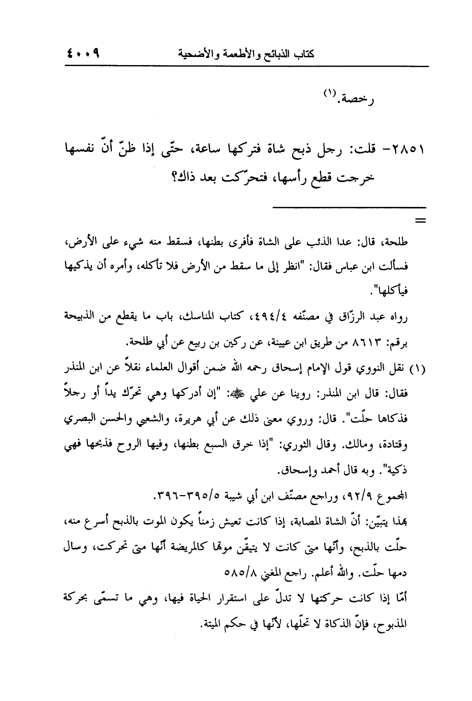 [2851-] قلت: رجل ذبح شاة فتركها ساعة، حتّى إذا ظنّ أنّ نفسها خرجت قطع رأسها، فتحرّكت بعد ذاك؟
