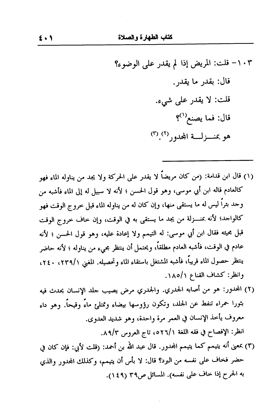 3 بمعنى أنه يتيمم كما يتيمم المجدور. قال عبد الله بن أحمد: (قلت لأبي: فإن كان في حضر فخاف على نفسه من البرد؟ قال: لا بأس أن يتيمم، وكذلك المجدور والذي به الجرح إذا خاف على نفسه) . المسائل ص39 (149) .
