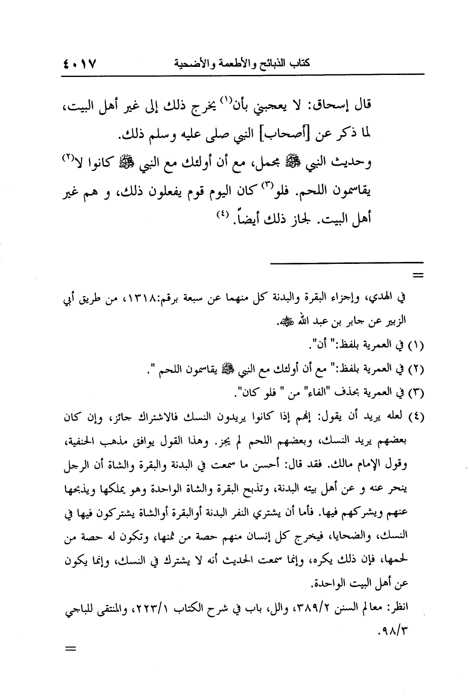 4 لعله يريد أن يقول: إنهم إذا كانوا يريدون النسك فالاشتراك جائز، وإن كان بعضهم يريد النسك، وبعضهم اللحم لم يجز. وهذا القول يوافق مذهب الحنفية، وقول الإمام مالك. فقد قال: أحسن ما سمعت في البدنة والبقرة والشاة أن الرجل ينحر عنه وعن أهل بيته البدنة، وتذبح البقرة والشاة الواحدة وهو يملكها ويذبحها عنهم ويشركهم فيها. فأما أن يشتري النفر البدنة أوالبقرة أوالشاة يشتركون فيها في النسك، والضحايا، فيخرج كل إنسان منهم حصة من ثمنها، وتكون له حصة من لحمها، فإن ذلك يكره، وإنما سمعت الحديث أنه لا يشترك في النسك، وإنما يكون عن أهل البيت الواحدة.