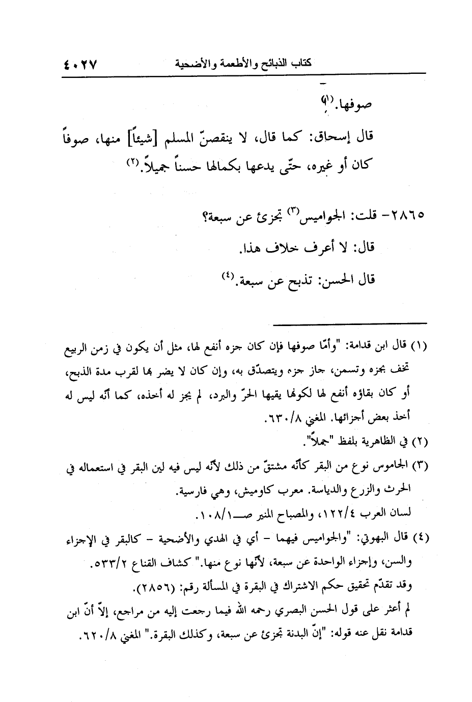4 قال البهوتي: "والجواميس فيهما - أي في الهدي والأضحية - كالبقر في الإجزاء والسن، وإجزاء الواحدة عن سبعة، لأنّها نوع منها." كشاف القناع 2/533.