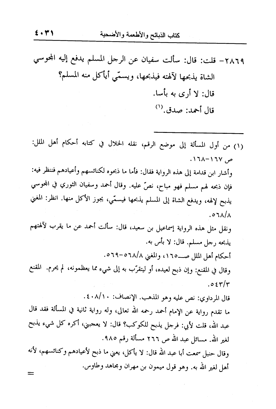[2869-] قلت: قال: سألت سفيان عن الرجل المسلم يدفع إليه المجوسي الشاة يذبحها لآلهته فيذبحها، ويسمّي أيأكل منه المسلم؟