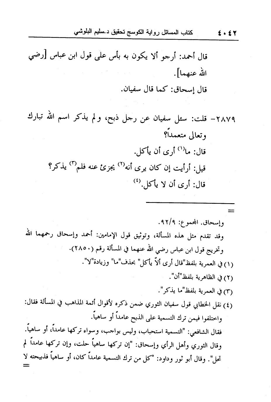 [2879-] قلت: سئل سفيان عن رجل ذبح، ولم يذكر اسم الله تبارك وتعالى متعمداً؟