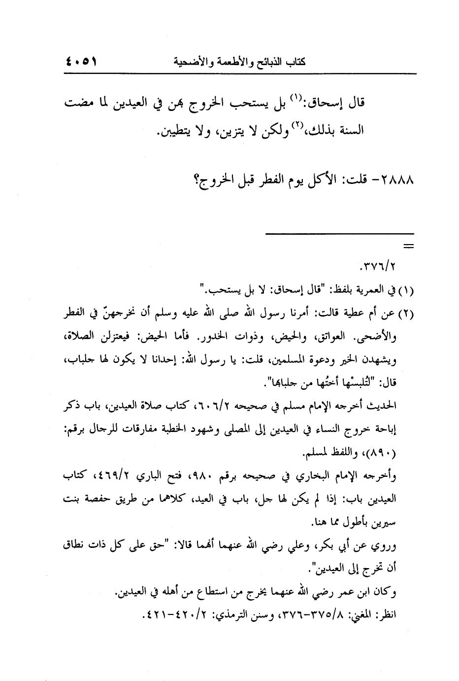 قال إسحاق: 1 بل يستحب الخروج بهن في العيدين لما مضت السنة بذلك، 2 ولكن لا يتزين، ولا يتطيبن.