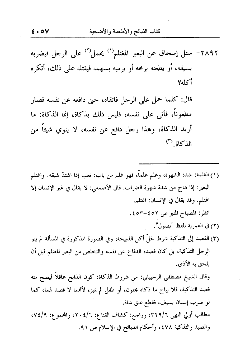 3 القصد إلى التذكية شرط لحلّ أكل الذبيحة، وفي الصورة المذكورة في المسألة لم ينو الرجل التذكية، بل كان قصده الدفاع عن نفسه والتخلص من البعير المغتلم قبل أن يلحق به الأذى.