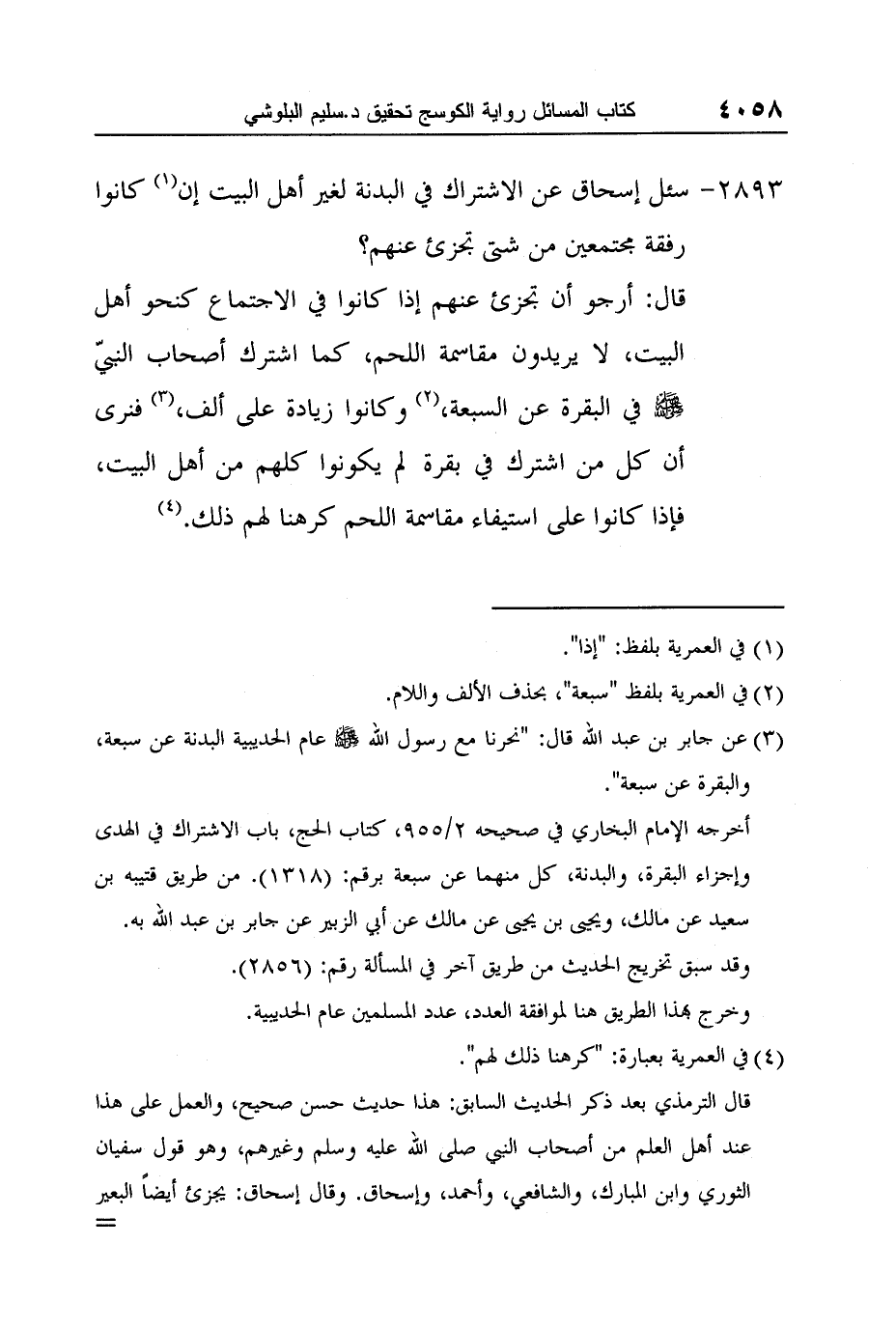 3 عن جابر بن عبد الله قال: "نحرنا مع رسول الله صلى الله عليه وسلم عام الحديبية البدنة عن سبعة، والبقرة عن سبعة".