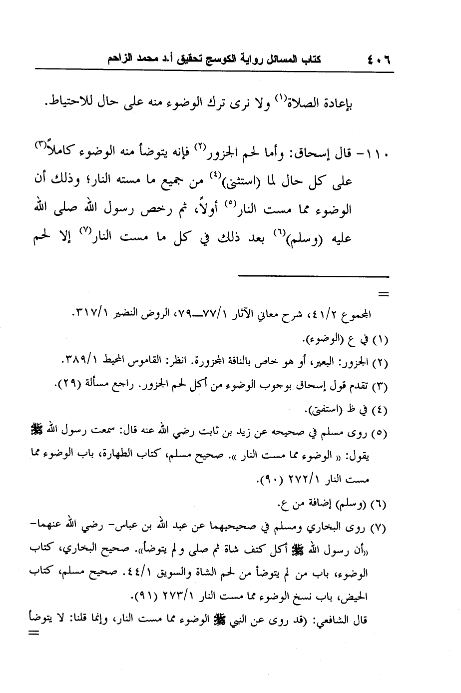 [110-] قال إسحاق: وأما لحم الجزور2 فإنه يتوضأ منه الوضوء كاملاً3 على كل حال لما (استثنى) 4 من جميع ما مسته النار؛ وذلك أن الوضوء مما مست النار5 أولاً، ثم رخص رسول الله صلى الله عليه (وسلم) 6 بعد ذلك في كل ما مست النار7 إلا لحم