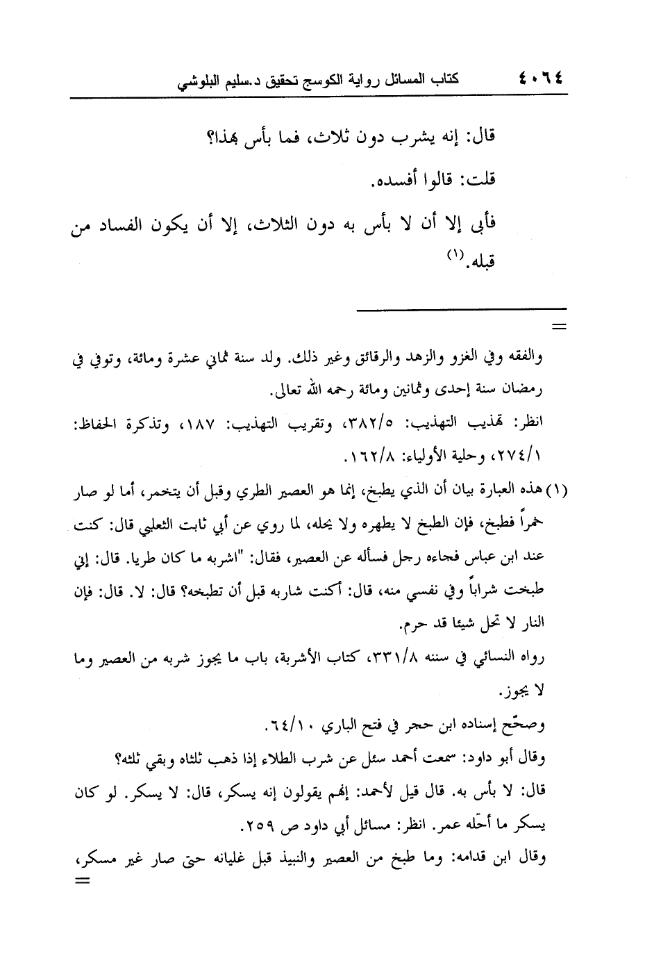 1 هذه العبارة بيان أن الذي يطبخ، إنما هو العصير الطري وقبل أن يتخمر، أما لو صار خمراً فطبخ، فإن الطبخ لا يطهره ولا يحله، لما روي عن أبي ثابت الثعلبي قال: كنت عند ابن عباس فجاءه رجل فسأله عن العصير، فقال: "اشربه ما كان طريا. قال: إني طبخت شراباً وفي نفسي منه، قال: أكنت شاربه قبل أن تطبخه؟ قال: لا. قال: فإن النار لا تحل شيئا قد حرم.