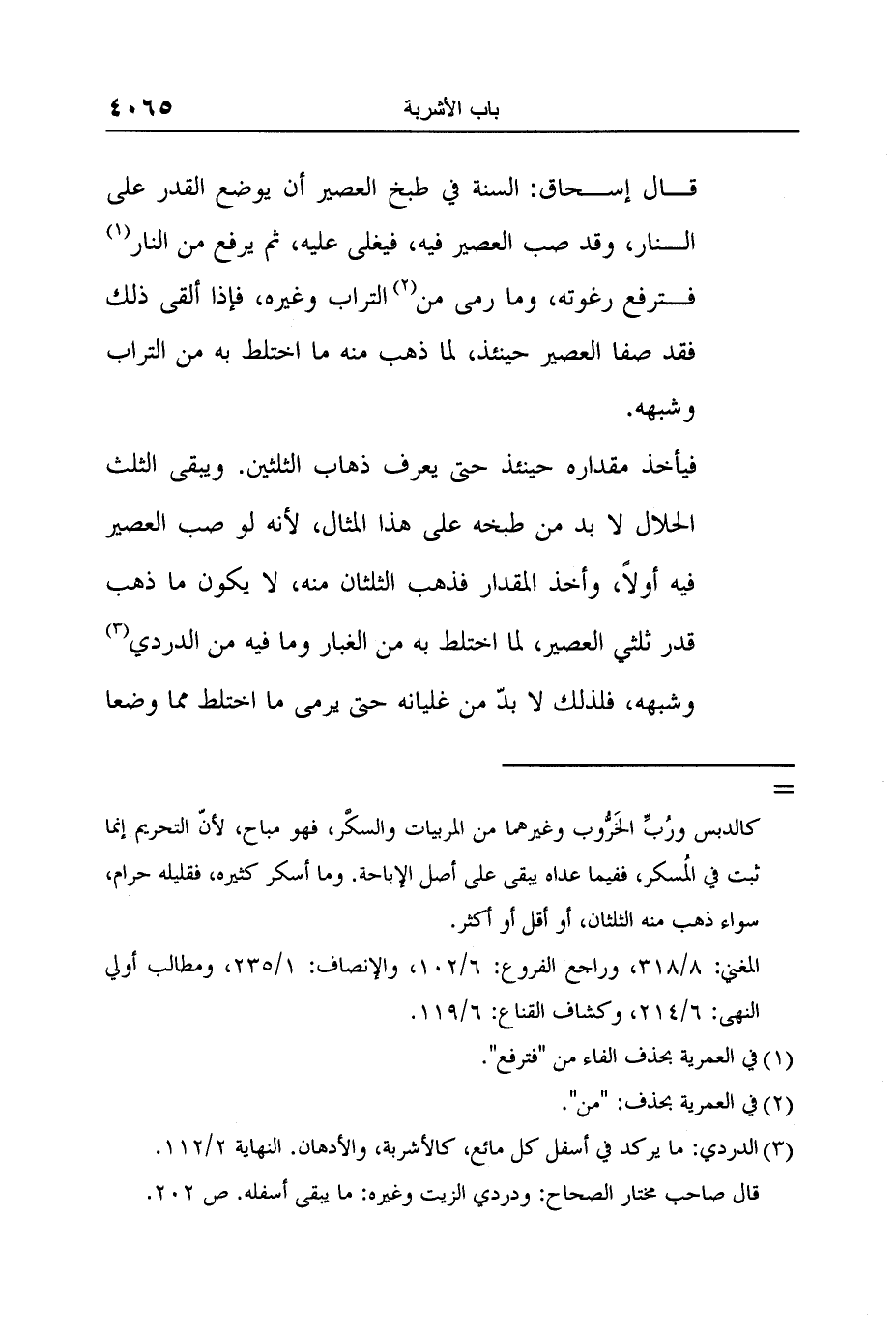 قال إسحاق: السنة في طبخ العصير أن يوضع القدر على النار، وقد صب العصير فيه، فيغلى عليه، ثم يرفع من النار 1 فترفع رغوته، وما رمى من 2 التراب وغيره، فإذا ألقى ذلك فقد صفا العصير حينئذ، لما ذهب منه ما اختلط به من التراب وشبهه.