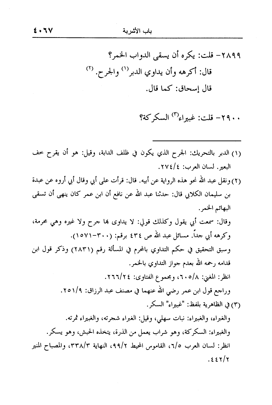 2 ونقل عبد الله نحو هذه الرواية عن أبيه. قال: قرأت على أبي وقال أبي أروه عن عبدة بن سليمان الكلابي قال: حدثنا عبد الله عن نافع أن ابن عمر كان ينهى أن تسقى البهائم الخمر.