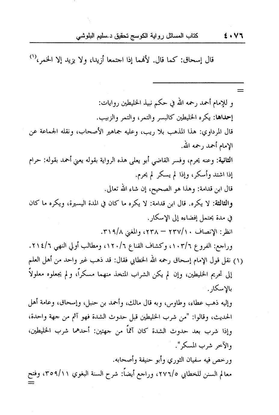 1 نقل قول الإمام إسحاق رحمه الله الخطابي فقال: قد ذهب غير واحد من أهل العلم إلى تحريم الخليطين، وإن لم يكن الشراب المتخذ منهما مسكراً، ولم يجعلوه معلولاً بالإسكار.