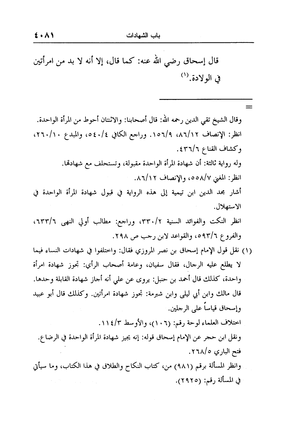 1 نقل قول الإمام إسحاق بن نصر المروزي فقال: واختلفوا في شهادات النساء فيما لا يطلع عليه الرجال، فقال سفيان، وعامة أصحاب الرأي: تجوز شهادة امرأة واحدة، كذلك قال أحمد بن حنبل: يروى عن علي أنه أجاز شهادة القابلة وحدها. قال مالك وابن أبي ليلى وابن شبرمة: تجوز شهادة امرأتين. وكذلك قال أبو عبيد وإسحاق قياساً على الرجلين.