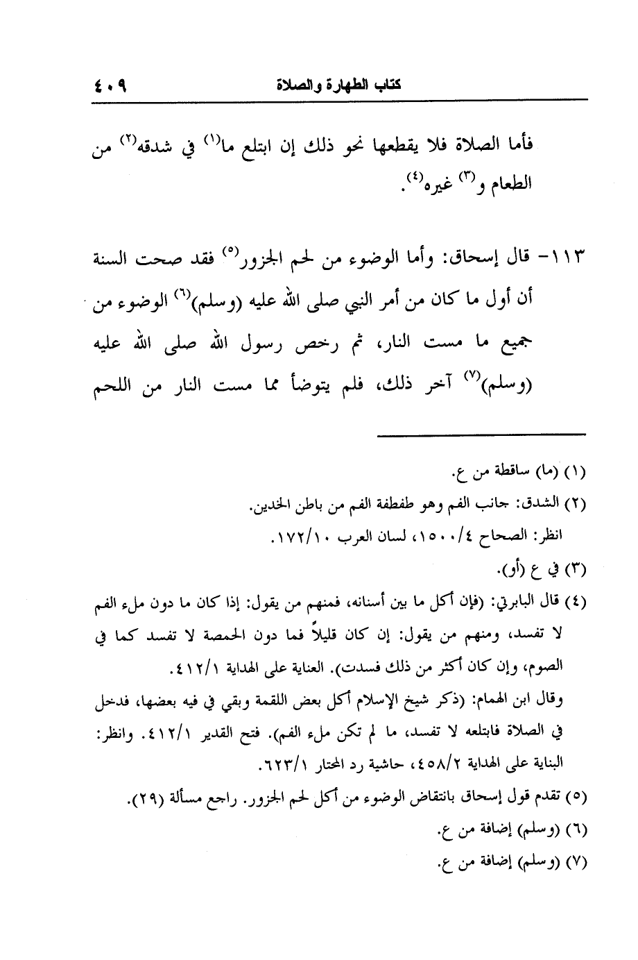 [113-] قال إسحاق: وأما الوضوء من لحم الجزور5 فقد صحت السنة أن أول ما كان من أمر النبي صلى الله عليه (وسلم) 6 الوضوء من جميع ما مست النار، ثم رخص رسول الله صلى الله عليه (وسلم) 7 آخر ذلك، فلم يتوضأ مما مست النار من اللحم