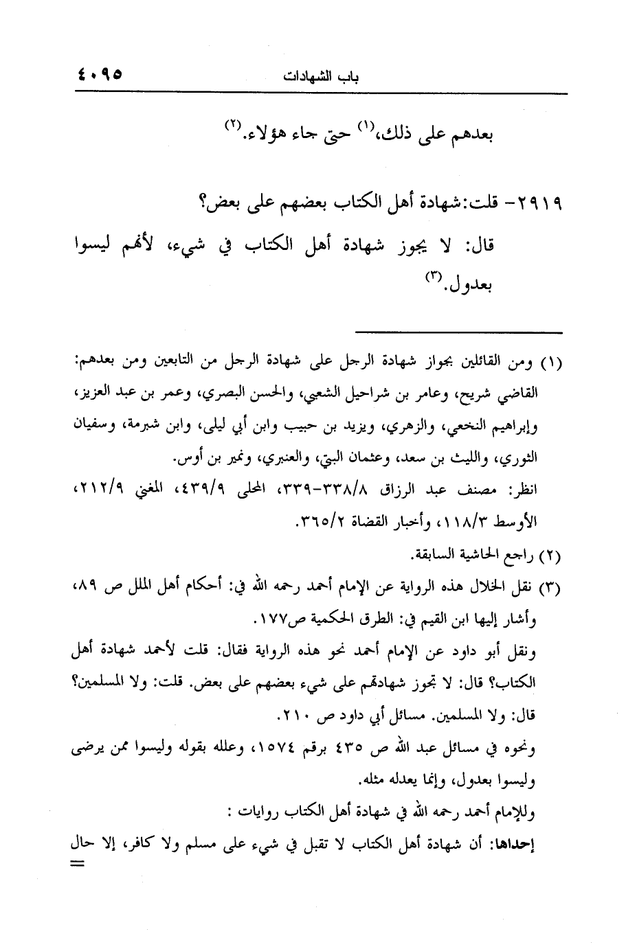 ونقل أبو داود عن الإمام أحمد نحو هذه الرواية فقال: قلت لأحمد شهادة أهل الكتاب؟ قال: لا تجوز شهادتهم على شيء بعضهم على بعض. قلت: ولا المسلمين؟ قال: ولا المسلمين. مسائل أبي داود ص 210.