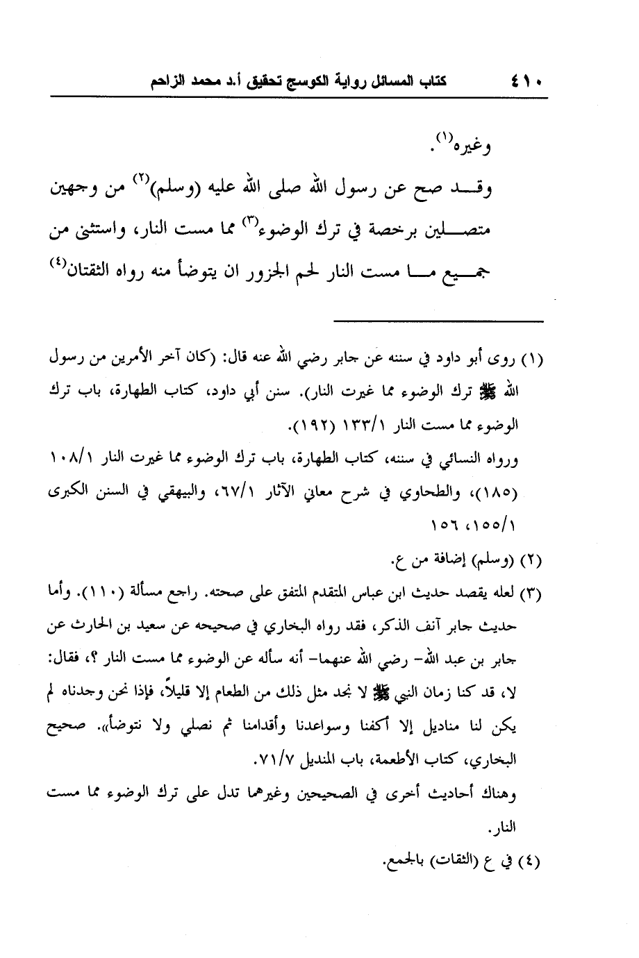 3 لعله يقصد حديث ابن عباس المتقدم المتفق على صحته. راجع مسألة (110) . وأما حديث جابر آنف الذكر، فقد رواه البخاري في صحيحه عن سعيد بن الحارث عن جابر بن عبد الله- رضي الله عنهما- أنه سأله عن الوضوء مما مست النار؟، فقال: لا، قد كنا زمان النبي صلى الله عليه وسلم لا نجد مثل ذلك من الطعام إلا قليلاً، فإذا نحن وجدناه لم يكن لنا مناديل إلا أكفنا وسواعدنا وأقدامنا ثم نصلي ولا نتوضأ". صحيح البخاري، كتاب الأطعمة، باب المنديل 7/71.