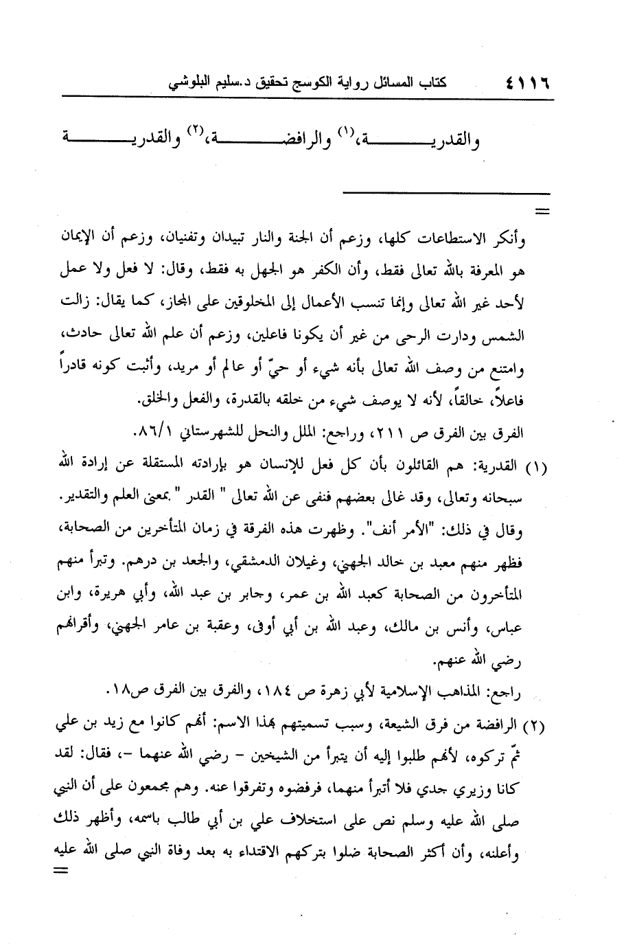 1 القدرية: هم القائلون بأن كل فعل للإنسان هو بإرادته المستقلة عن إرادة الله سبحانه وتعالى، وقد غالى بعضهم فنفى عن الله تعالى " القدر " بمعنى العلم والتقدير. وقال في ذلك: "الأمر أنف". وظهرت هذه الفرقة في زمان المتأخرين من الصحابة، فظهر منهم معبد بن خالد الجهني، وغيلان الدمشقي، والجعد بن درهم. وتبرأ منهم المتأخرون من الصحابة كعبد الله بن عمر، وجابر بن عبد الله، وأبي هريرة، وابن عباس، وأنس بن مالك، وعبد الله بن أبي أوفى، وعقبة بن عامر الجهني، وأقرانهم رضي الله عنهم.
