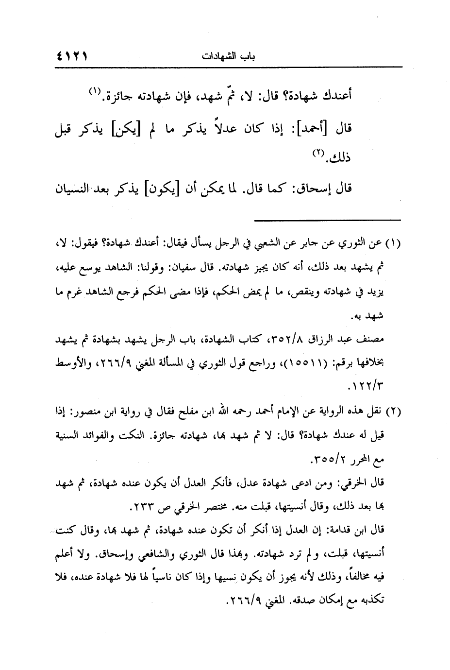 2 نقل هذه الرواية عن الإمام أحمد رحمه الله ابن مفلح فقال في رواية ابن منصور: إذا قيل له عندك شهادة؟ قال: لا ثم شهد بها، شهادته جائزة. النكت والفوائد السنية مع المحرر 2/355.